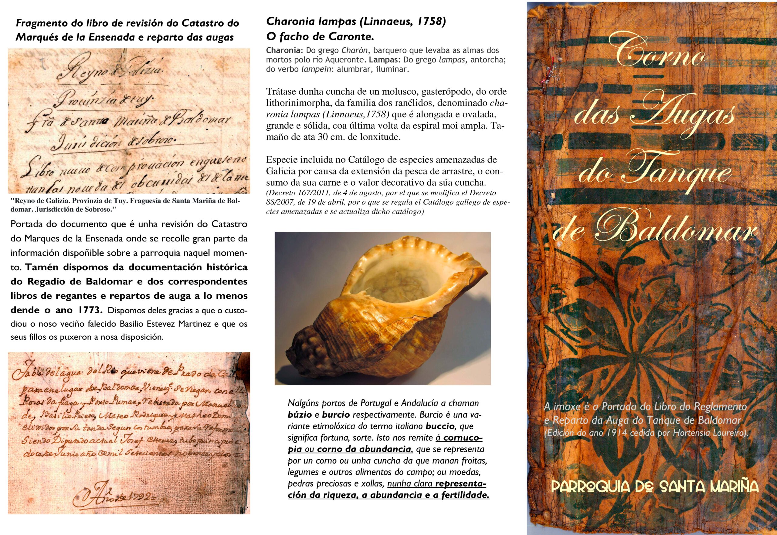 A parroquia de Santa Mariña de Covelo conserva documentación histórica do regadío de Baldomar, así como dos correspondentes libros de regantes e repartos de auga, que data de 1773 (cortesía do finado Basilio Estévez Martínez, que os conservou e nos permitiu a súa dixitalización).