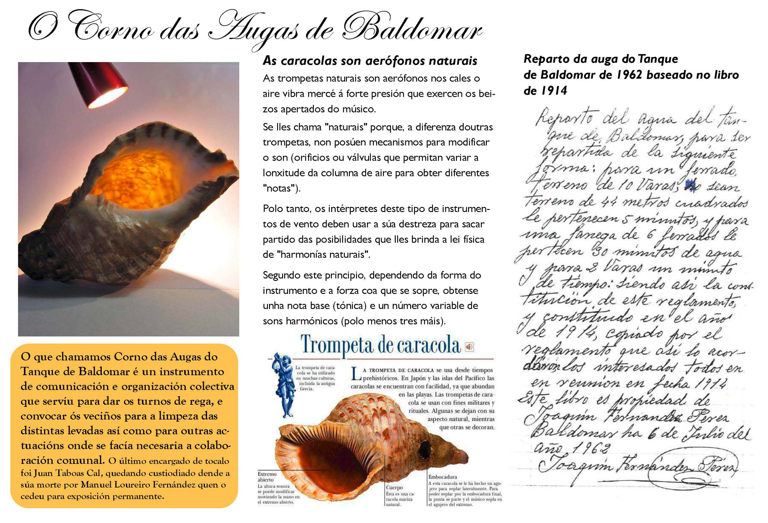 O último veciño en tocalo foi Juan Táboas Cal “Juanito” que tiña a destreza para sacar partido do instrumento a través da lei física de“harmonías naturais”. Segundo este principio, dependendo da forma do instrumento e a forza coa que se sopre, obterase una nota básica (tónica) e un número variable de sons harmónicos (cando menos tres máis). Este instrumento musical arcaico é utilizado en todo o mundo desde a prehistoria.